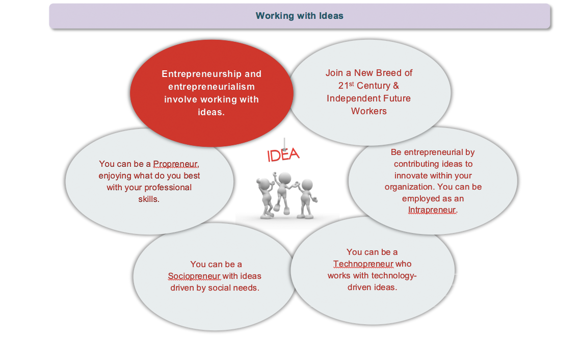 Professionals can also make a business out of their professions either by themselves or by collaborating with other professionals. They are called “propreneurs” who are typically less interested in the running of the business but love what they do in their profession. They are another new breed of 21st Century workers. Useful websites on propreneurship: